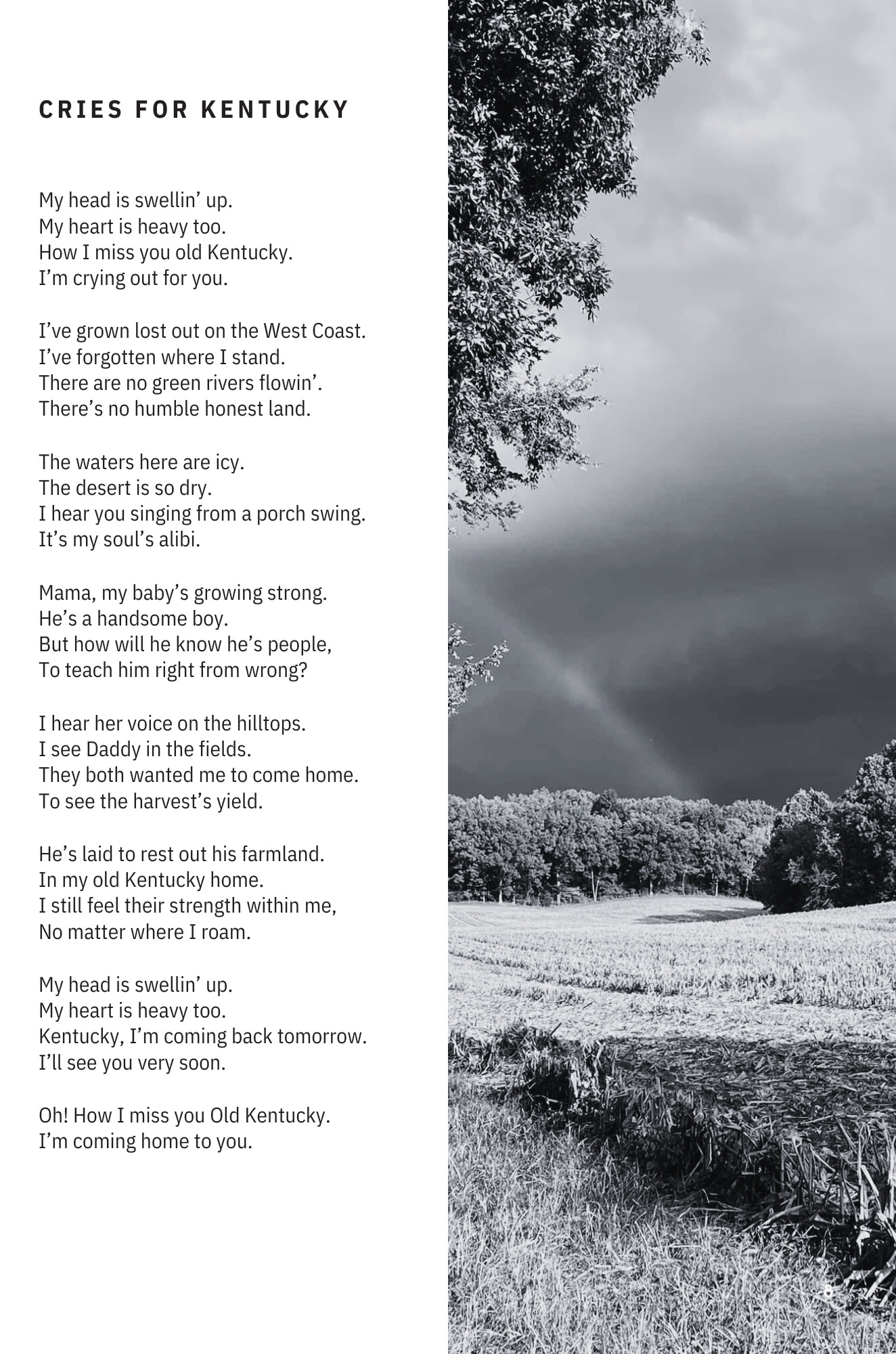 Bleed means that the content will extend to the edge of the page leaving no white trimming around the edges. If you are writing a book with images, backgrounds, and large graphics, for example, you would want the images to extent to the edge of the page. Here’s an example from my soon to be released poetry collection, “Kentucky Soulminer.”